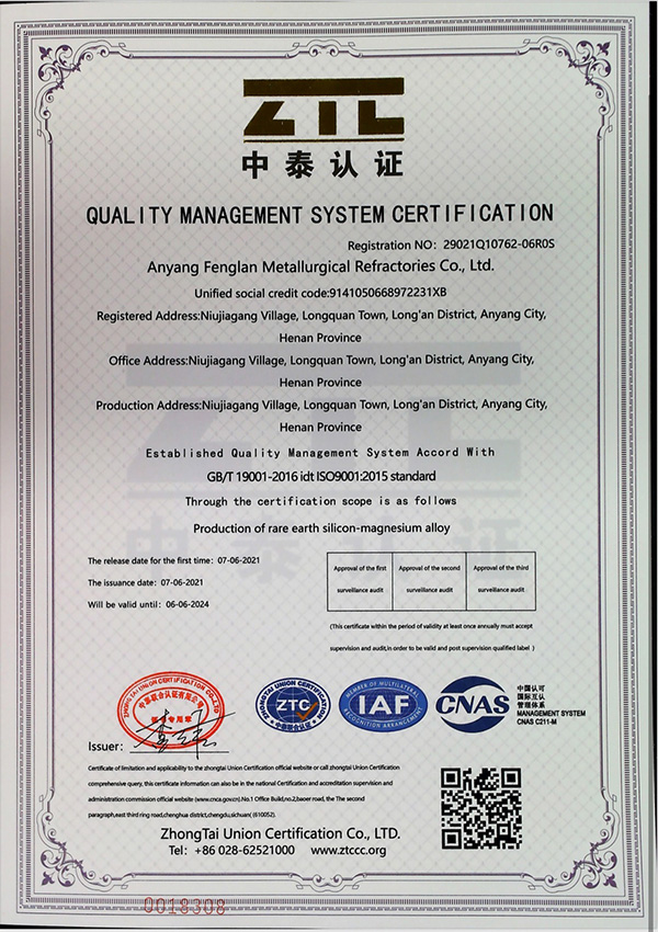 原材料均采用高品質經過脫氧和除銹處理,并通過特殊熔煉設備進行生產.合金的熔煉在保護性氣氛中進行,出爐倒入模具中采用快速冷卻使得合金氧化鎂含霣極低,品質、顏色、密度達到高標準。其中稀土鎂球化劑中的氧化鎂含屋可以穩定控制在0.7%以下。